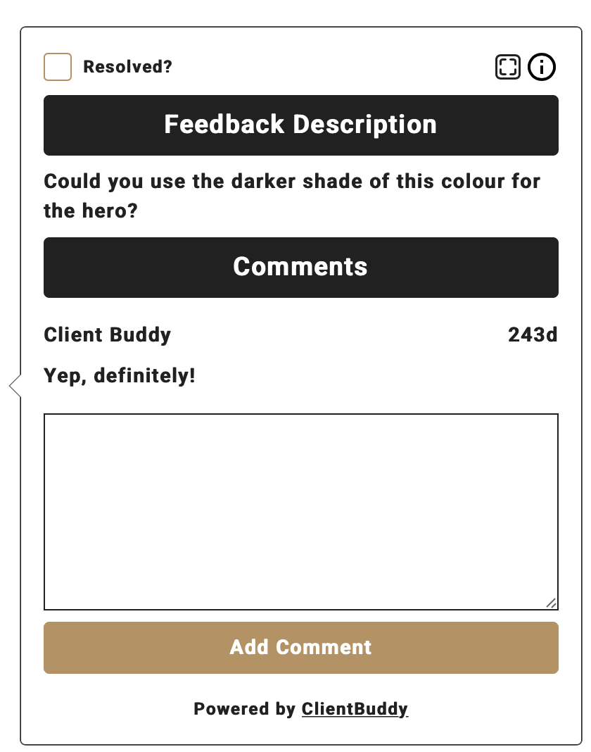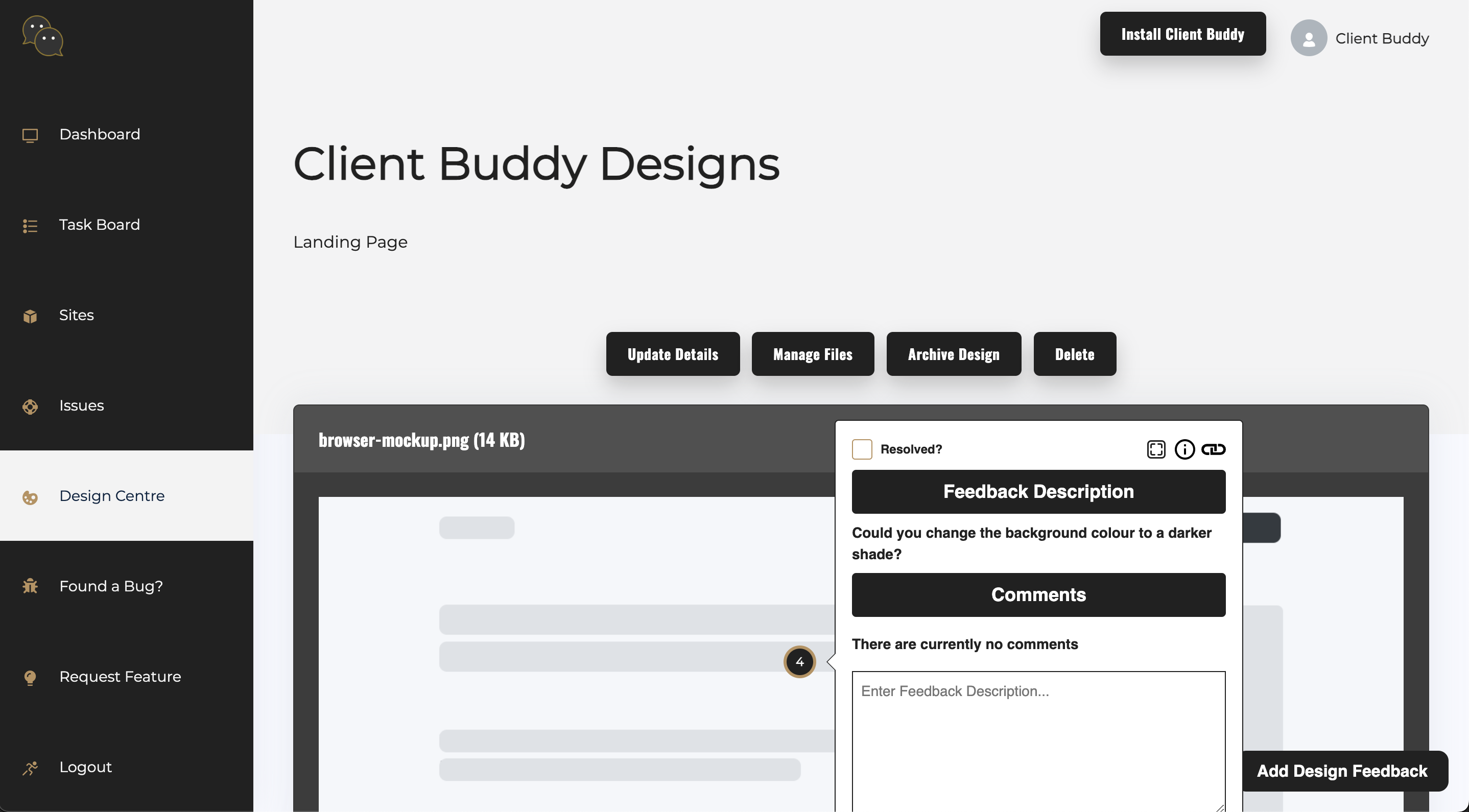 Use the Design Centre to upload designs to Client Buddy where your clients can use the widget to give feedback.