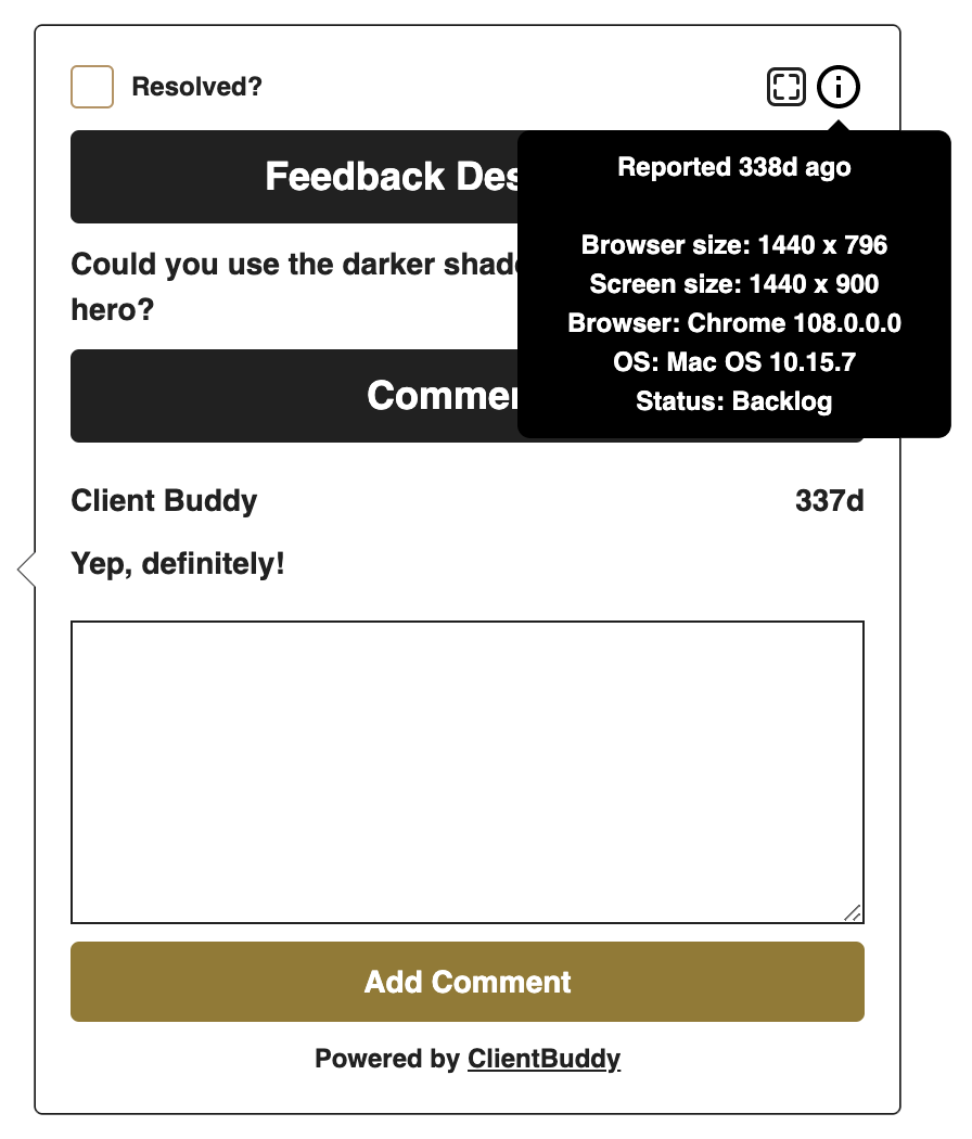 When your client sends a bug report using Client Buddy's widget, important information such as a screenshot of the issue as well as the user's Operating System, browser and screen dimensions get automatically captured, saving you and your client time and effort.