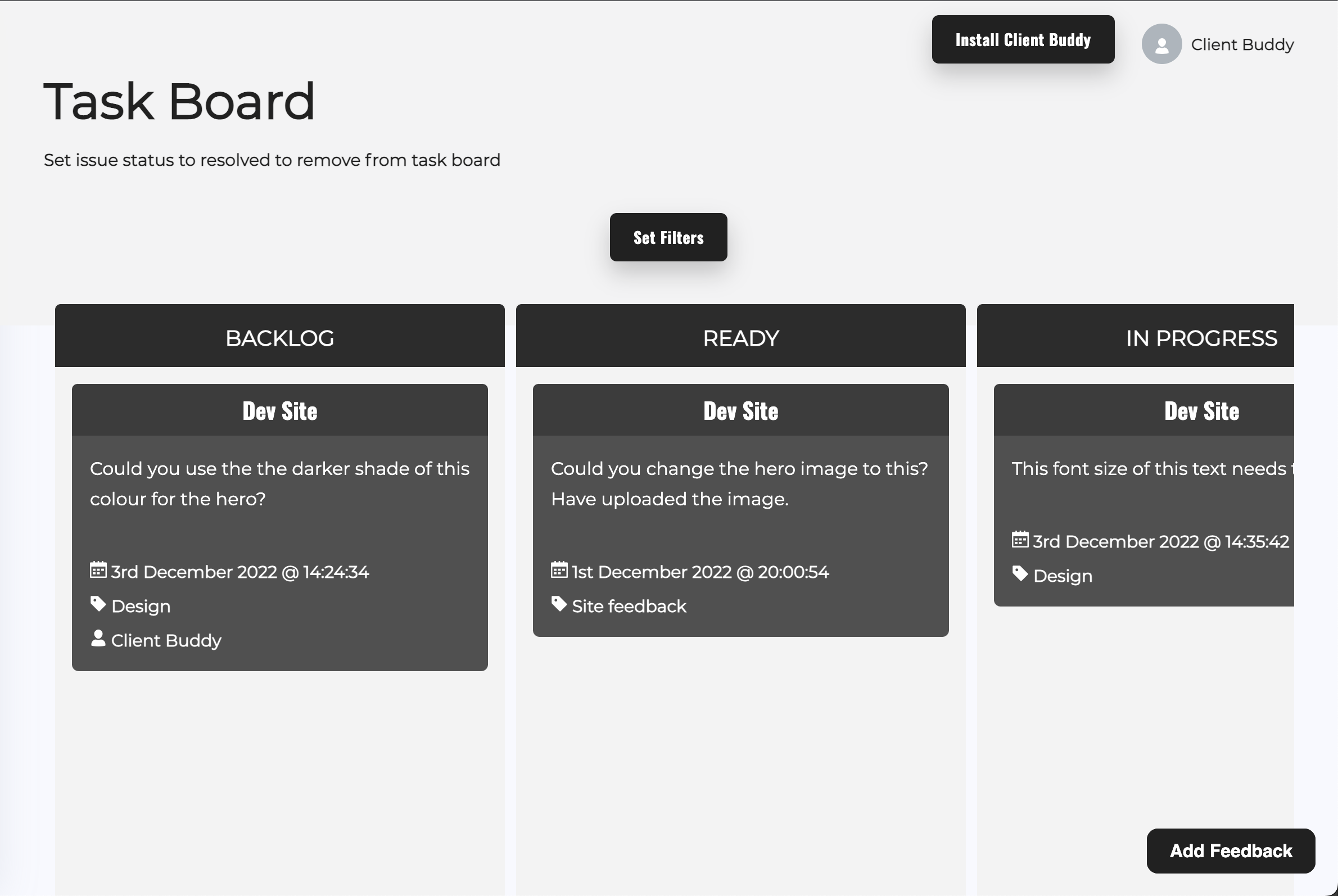 Customise your Client Buddy widget from the dashboard and copy + paste it to the head of your website. This will install the widget and allow your client to start reporting issues and sharing feedback directly on your website.